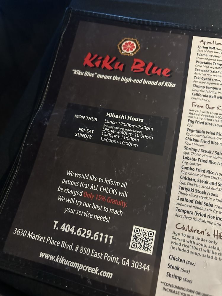 “ I love kiku. I have never had a bad meal ever. The sushi the steak was tender and scallops were juicy and moist. The veggies were cooked to a delightful crunch. Beware of the fire. When they star off but very good I wish I could tell you all the wonderful dishes I have had but I am tired of typing on my phone in a restaurant. I got pour this YumYum sauce and chow down. It ain't much for looks but it very good ”